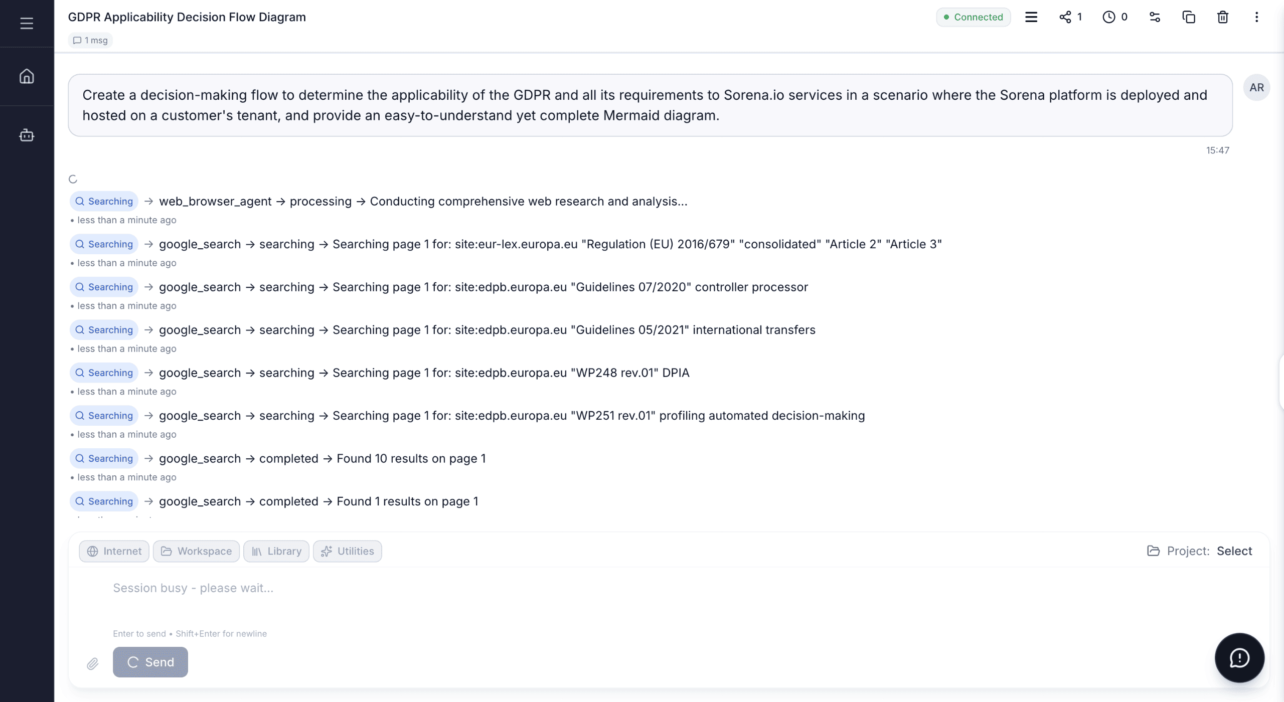 The copilot searches your document library (Swedish laws, NIST, ETSI, EU regulations, and more), performs web searches across trusted public sources to fetch the latest information, and retrieves documents from your project files. When needed, multiple browser workers run in parallel so research stays fast. All sources are searched simultaneously.